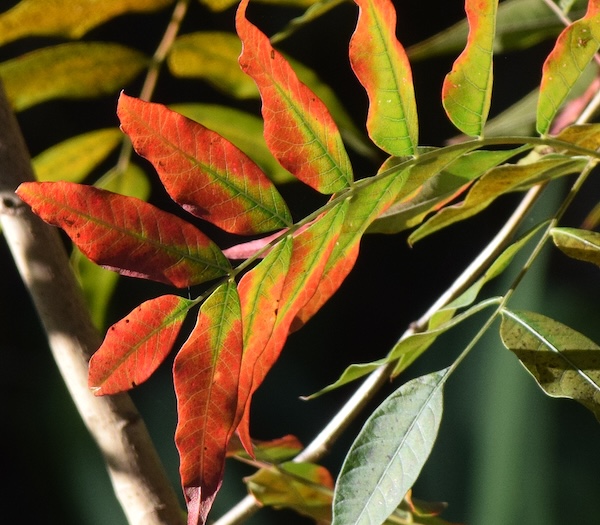TH writes: “Unfortunately, I don’t know which tree/bush these leaves belong to. I loved how the sun spotlighted its vibrant colors. ” Red and green to suit the season.