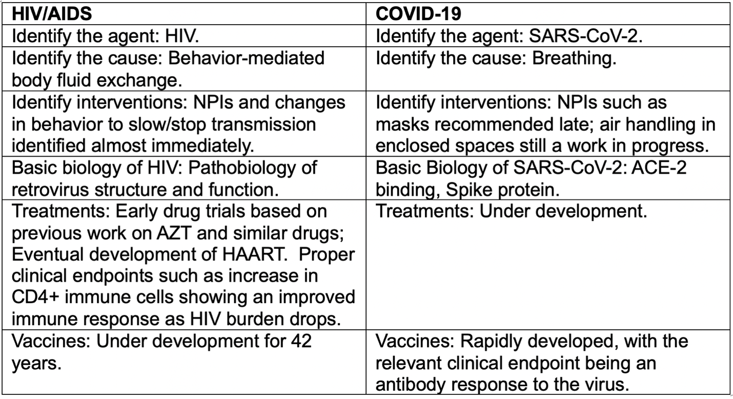 Two pandemics forty years apart illustrate how politics, society, and science converge during a worldwide medical emergency. The response to HIV/AIDS occurred in a different world, in which biomedical science was not yet an adjunct of Big Pharma and Big Medicine. AIDS is still with us, but we have the knowledge if not the political acumen to treat it if not vanquish it. COVID-19 emerged long after the neoliberalization of science had taken hold, and our progress in dealing with another worldwide pandemic seems to have generated more heat than light, although AIDS generated some of the former. Different assumptions, different politics, and different infrastructures determined the response to COVID-19, and we are still dealing with a great deal of uncertainty regarding the origin and likely progression of COVID-19, whatever the politico-medical establishment would have us believe.