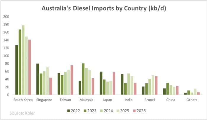 Jet fuel is primarily sourced from China, with cargoes amounting to approximately 190,000 barrels per day in February 2026. Gasoline flows are primarily sourced from Singapore and South Korea, which together account for around two-thirds of Australia’s average gasoline imports of 210,000 barrels per day in 2025.