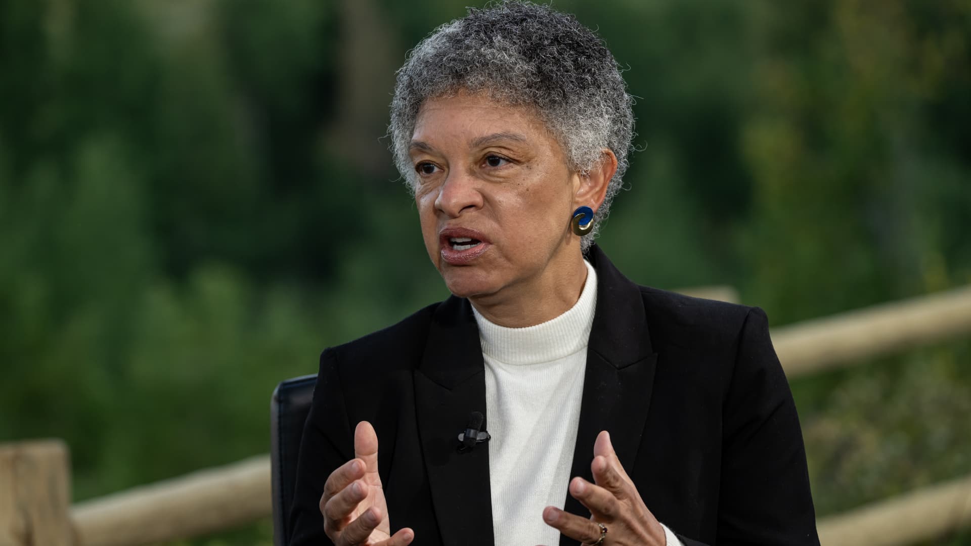 Susan Collins, president and chief executive officer of the Boston Fed, speaks to Bloomberg TV during the Kansas City Fed’s Jackson Hole Economic Policy Symposium on Friday, August 22, 2025 in Moran, Wyoming.