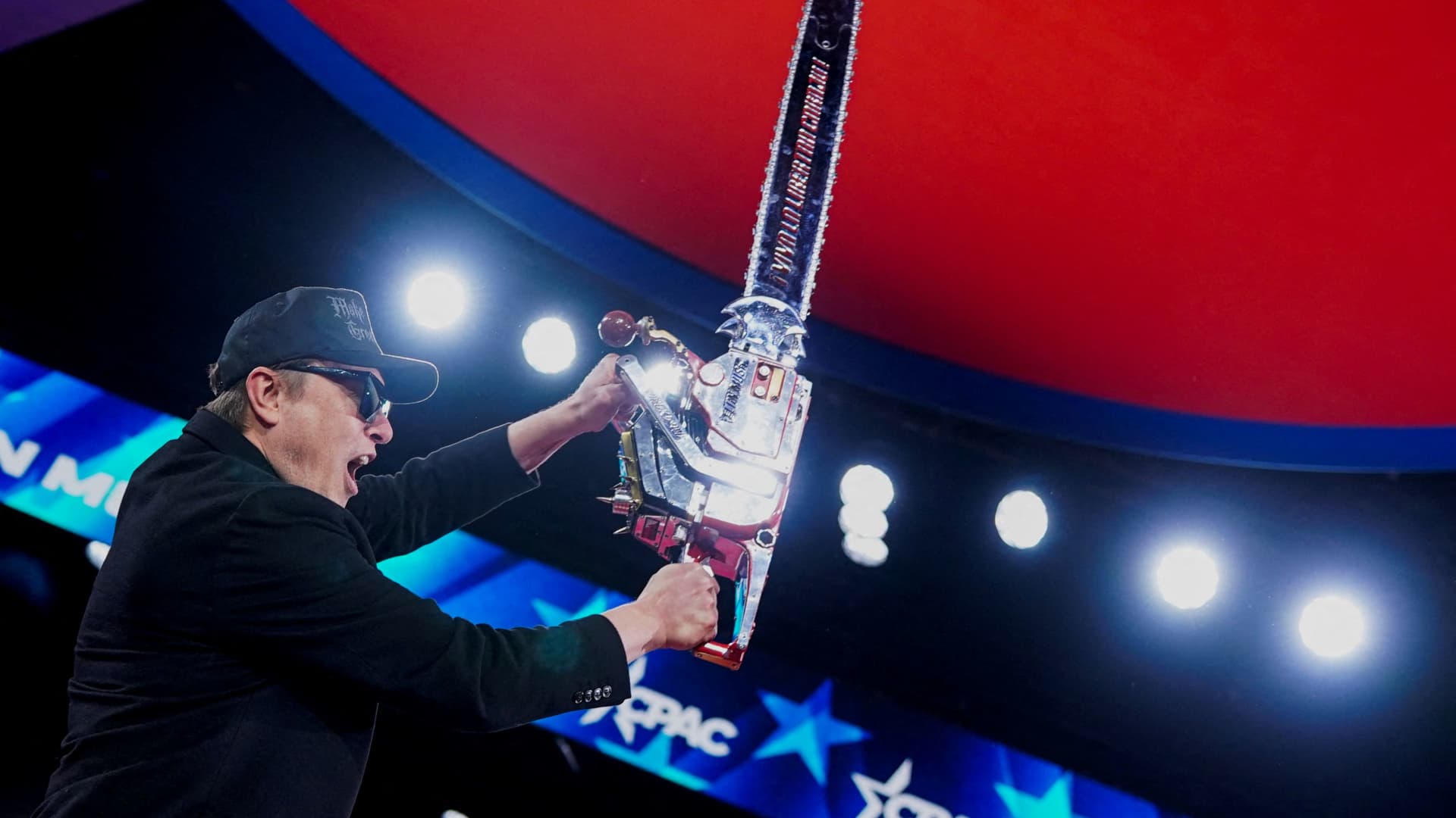 Elon Musk holds a chainsaw on stage at the Conservative Political Action Conference (CPAC) held in National Harbor, Maryland, USA on February 20, 2025.