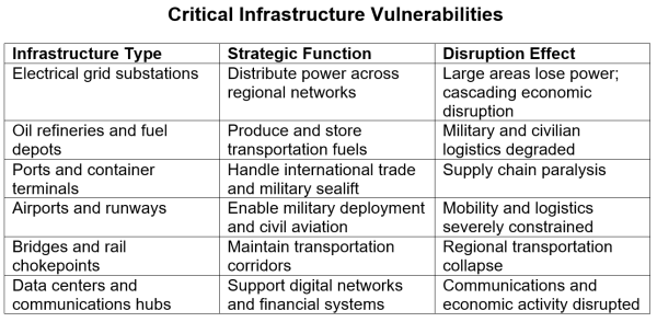 Modern societies are particularly exposed to such pressures because their economic functioning depends on vulnerable critical nodes. Electrical substations, oil refineries, container ports, major bridges, and railway junctions support the logistics metabolism of developed countries. Damage to just a few of these facilities can have cascading effects on supply chains and energy networks. The vulnerabilities in these systems are not just theoretical. Large infrastructure facilities are expensive, geographically fixed, and often take time to repair. Even minor interruptions can have repercussions far beyond the immediate point of attack. This reality means that strategic disruption no longer requires large-scale bombing campaigns. Precision strike systems allow a relatively small number of weapons to have a wide range of economic impact.