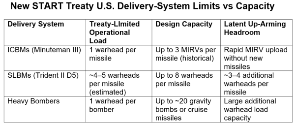 Unrestricted nuclear weapons expansion does not begin with new missiles, submarines, or bombers. That would start by putting more warheads on existing missiles and bombers. During the New START era, the United States and Russia did not dismantle the potential of their delivery systems. We just limited how much capacity is deployed and how it is counted. Therefore, warhead uploading, or placing additional warheads on existing multi-warhead missiles, remains the fastest way to increase deployed nuclear forces.