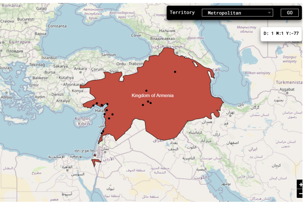 Figure 1. Territorial projection of the Kingdom of Armenia at its zenith in 77 BCE, illustrating the spatial foundation upon which later claims to sovereignty and identity would be constructed.
