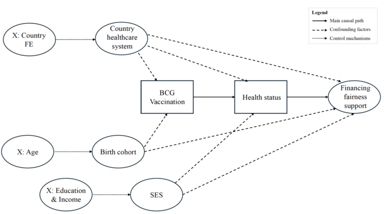 Figure 1 shows a directed acyclic graph visualizing our identification strategy, illustrating the causal paths from BCG vaccination to health status to funding equity preferences and the potential confounders that our methodology addresses. Consider two competing hypotheses.