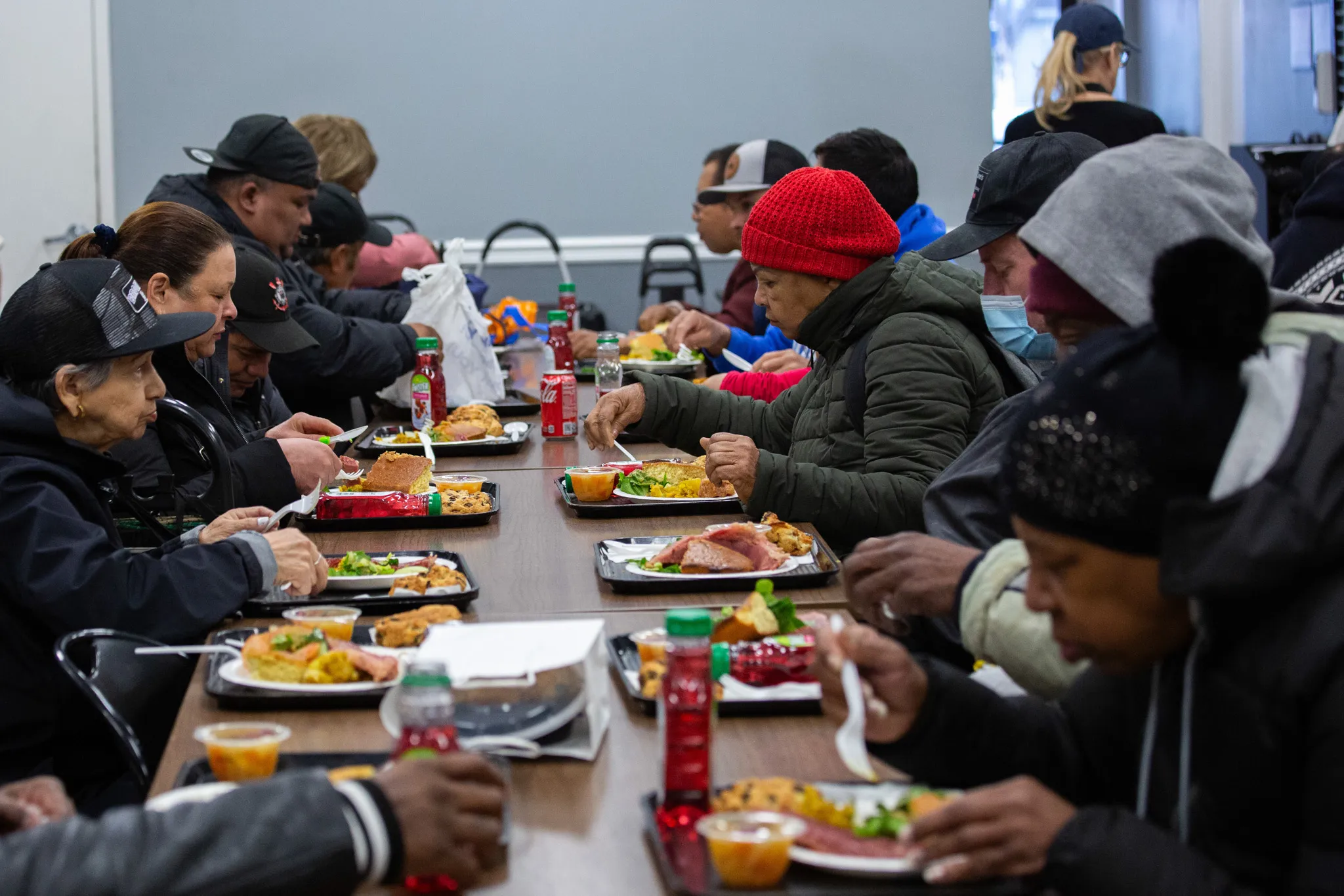 People eat dinner at the Food Bank for New York City’s Harlem kitchen, April 2, 2025. Credit: Ben Fractenberg/THE CITY