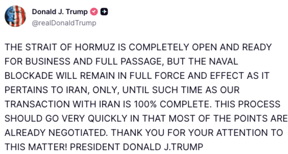 Admittedly, some of this outcome is due to Iran choosing to selectively play along, for reasons I cannot fully fathom. The current example is the “Strait of Hormuz is completely open,” which is a Trump and market pleasing framing, as confirmed by a drop in paper oil prices.