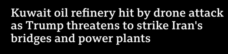 Kuwait: Emergency services have been responding to fires at an oil refinery in Kuwait after it was hit by Iranian drones. Separately, a power and water desalination plant has been attacked.