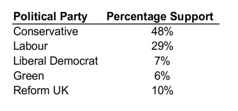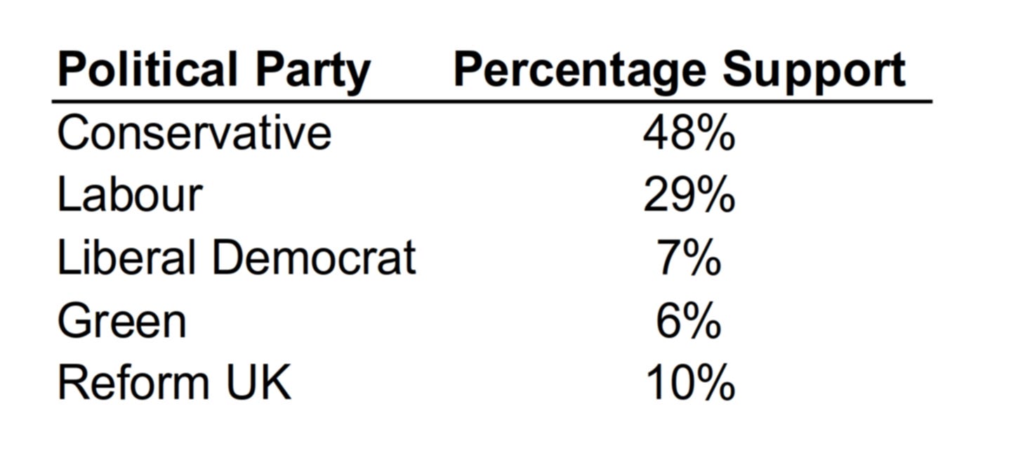 So, according to pollsters, we have numbers purporting to show Jo’s level of affinity with each party. As the raw “percentages” suggest, she feels most aligned with the Conservatives, then Labour, with Reform UK, the Lib Dems and Greens in that order a distant 3rd, 4th and 5th. However, this could just as easily be a potentially deeply misleading characterisation of her views.