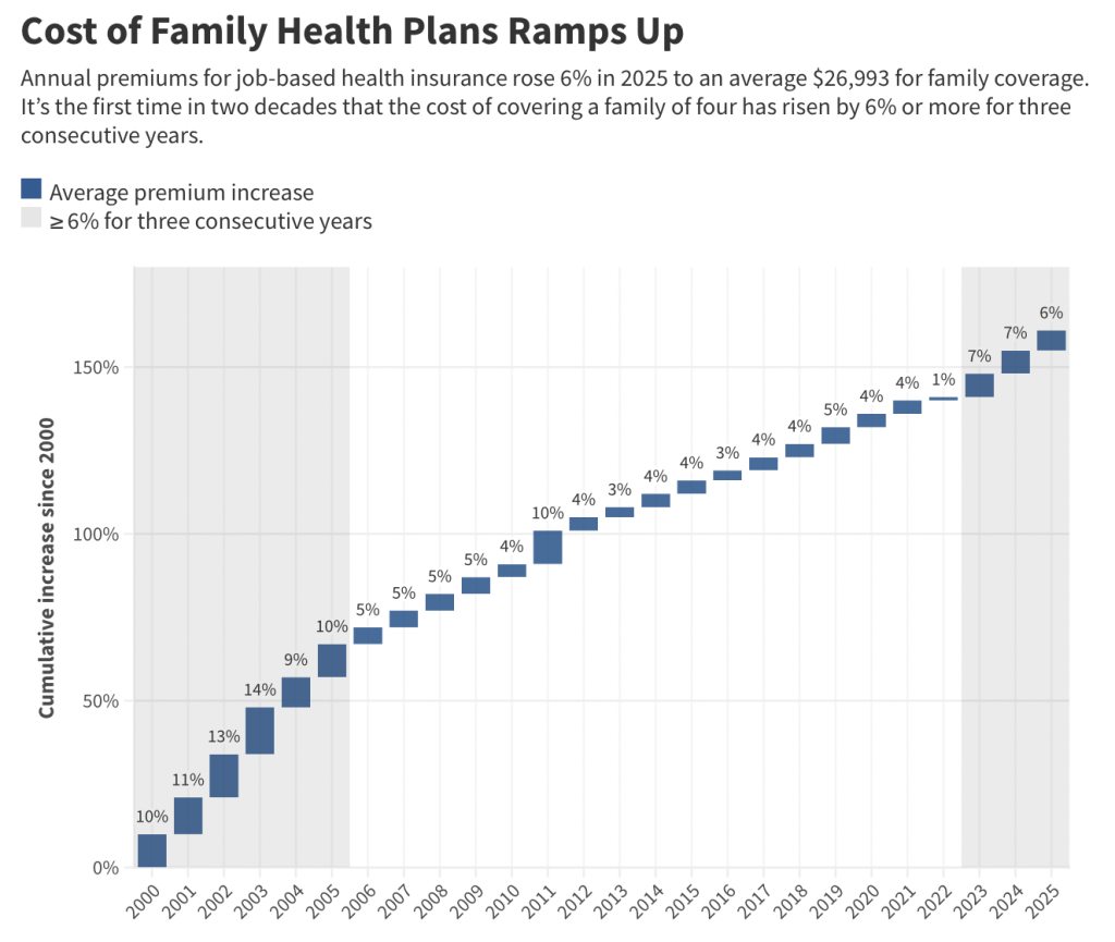 This is the first time in 20 years that the cost of covering a family of four has increased by more than 6% for three consecutive years, according to KFF data.