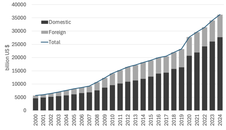 The world accumulates large international dollar involvement, primarily invested in the US Treasury (Figure 1). Approximately a quarter of US federal debt (over 120% of US GDP) is produced overseas due to its safe assets status and the dollar has become a sectarian.
