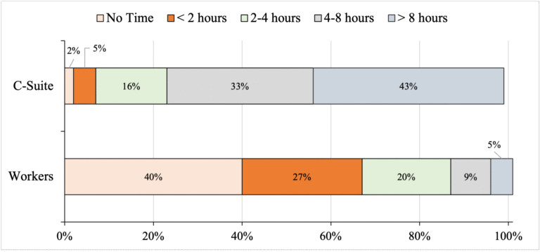 For one, AI-generated ‘work-slop’ is hurting worker motivation and productivity. The C-Suite thinks AI is a tool for enhancing business productivity, but employees tell a very different story. The Wall Street Journal reported on findings by research firm Section, which surveyed 5,000 white-collar workers from companies with more than 1,000 employees (Figure 1). More than 70% of the corporate executives in the survey said they were “excited” by AI, and 43% of them said the tools have saved them more than 8 hours of work per week. But non-management workers had a very different take on AI. Almost 70% of this group said AI made them feel “anxious or overwhelmed,” and 40% said the tools saved them no time at all; 27% of non-supervisory workers saved less than 2 hours each week using AI-tools. Many employees report that any time saved by using AI is offset by the need to correct AI output or work through confusion and rework. 4 out of 10 employees would be fine never using AI again. Dealing with work-slop is demotivating and drains worker productivity. It also breeds distrust within the organization — colleagues use AI to produce a report and you have to work overtime to correct the mistakes, fill in the gaps, and remove the non-existent references.