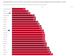 Since COVID-19, cash’s role has shrunk significantly in most jurisdictions, even in cash-loving ones like Switzerland and Austria. According to the findings of the Swiss National Bank’s latest survey of people’s spending habits, conducted in late 2024, cash has already been overtaken by the debit card as the most frequently used means of payment.