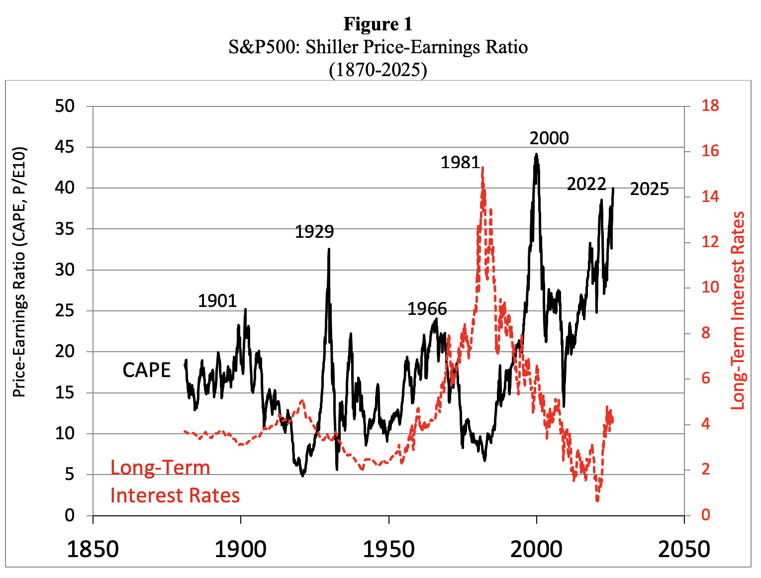 The U.S. stock market is definitely firmly in bubble territory. Figure 1 presents data on the S&P 500’s Shiller P/E Ratio, calculated as average inflation-adjusted earnings from the previous 10 years. Historically, a Shiller P/E Ratio above 30 has been a harbinger of speculative excess, followed by a bear market. In December 2023, the Shiller index rose to 30.45 and has remained above 30 ever since; in November 2025, the Shiller P/E ratio rose above 40.