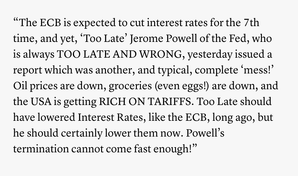 That’s not important to Trump, but if he kicks out Powell, the economy is literally exposed and he’s dragged out of WH like Mussolini.